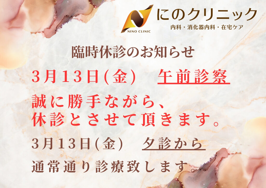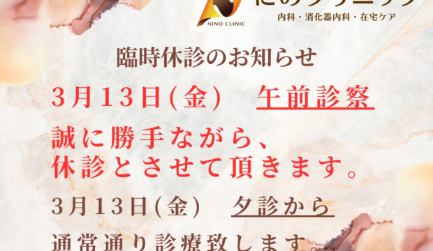 誠に勝手ながら、3月13日(金)「午前診のみ」休診とさせて頂きます。