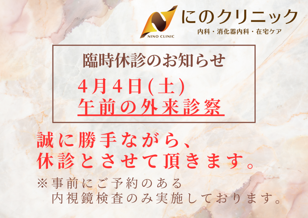 事前にご予約のある内視鏡検査の患者様は、午前中に実施しておりますが、外来は休診のため、お間違いないようお気をつけ下さい。